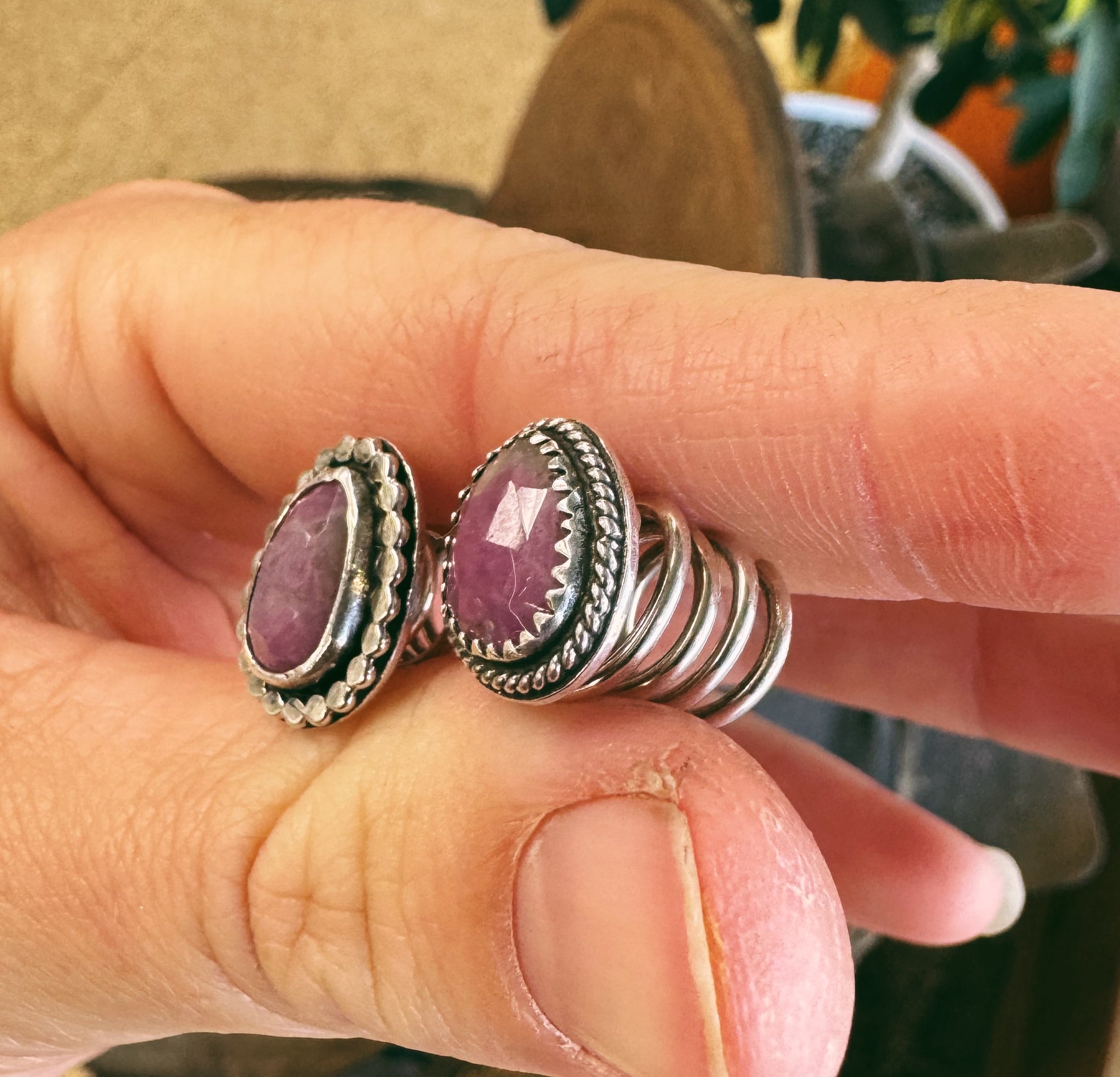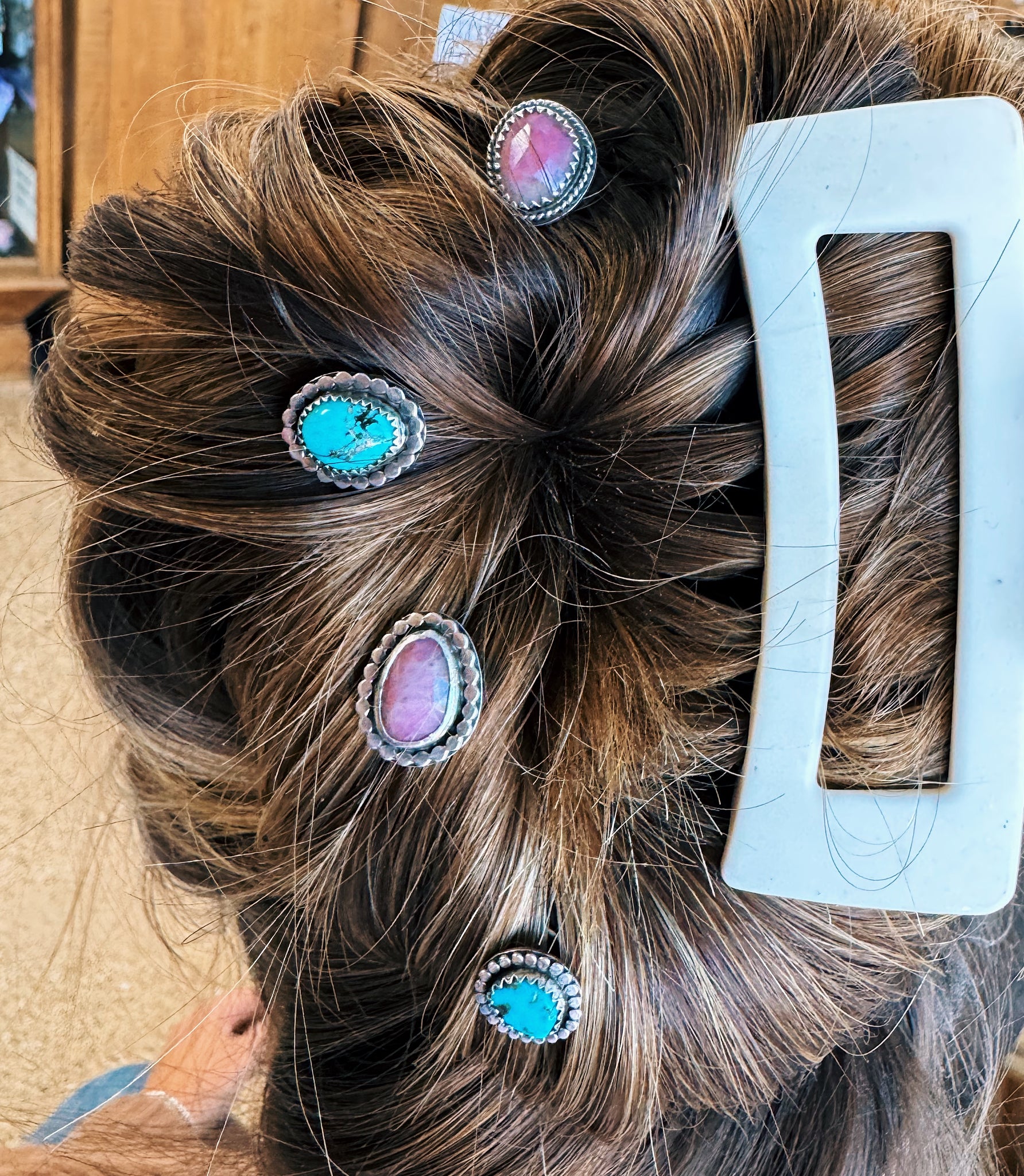 Stone and sterling silver hair accessories. These have a sterling silver corkscrew attatched to the back and work by twisting the accessory into your hairstyle. Perfect to accent updo’s or fixed styles like braids, or even textured ponytails.